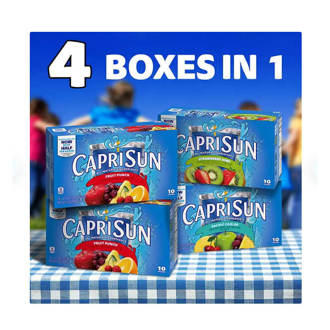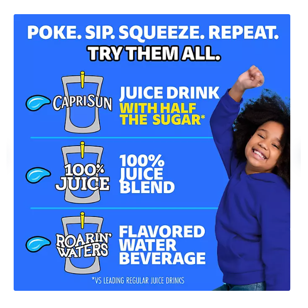 Keep Capri Sun Juice Pouches in your pantry. Your kids can help themselves to this delicious drink after playing outdoors with friends or doing homework. Take them with you on a camping or road trip. Individually packaged, they also make a convenient snack for on the go. Contained in a pouch, they won't take up a lot of room in a lunchbox or backpack.