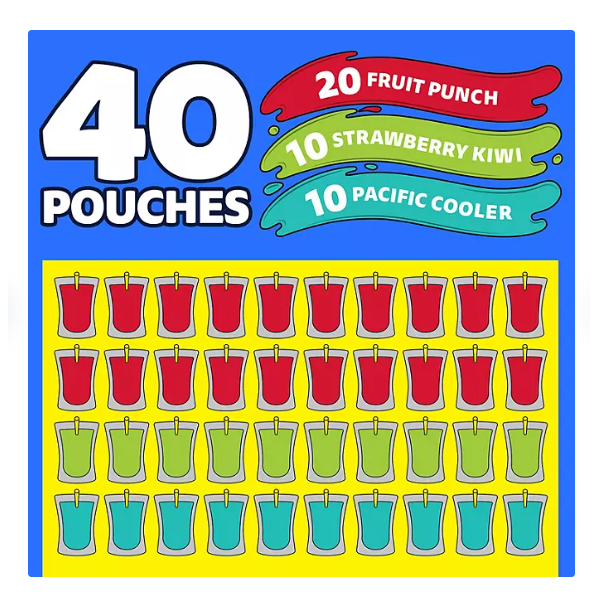 With your purchase, you will receive 10 pouches of each flavor. The flavors include Fruit Punch, Pacific Cooler, Wild Cherry and Strawberry Kiwi. Offering the taste of real fruit, they will satisfy the palate of both the young and old.