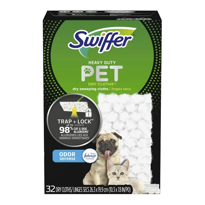 Swiffer Sweeper Heavy Duty Pet Dry cloths are super thick with fluffy 3D fibers that clean everywhere, even deep in grooves, to trap and lock 2X* dirt, dust and pet hair. Yep, shed happens... but Sweeper Heavy Duty Dry cloths make it easy to keep up and reduce odors. Use with your Swiffer Sweeper Dust Mop - the convenient combination of a broom and mop for a quick and easy clean. *vs Swiffer Sweeper Multi-Surface Dry Cloth. Made from Polyester/Polyethylene. 32 Swiffer Heavy Duty Pet Dry Cloths, 0.7 lb