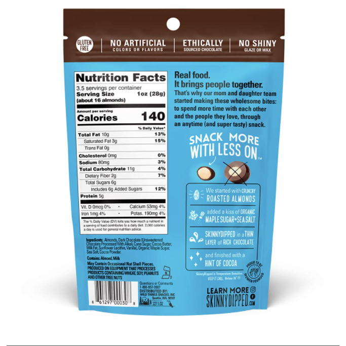 - ALWAYS REAL INGREDIENTS: SkinnyDipped Almonds are steam pasteurized and made with real ingredients that are Non-GMO and Gluten Free. Absolutely no artificial ingredients or flavors.