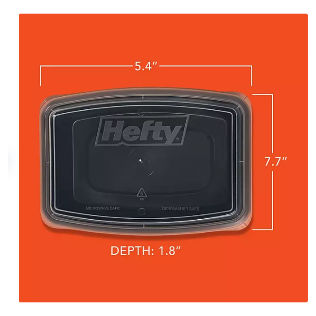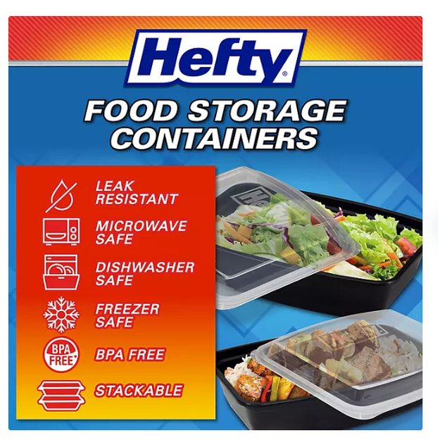 Hefty Plastic Food Storage Containers with Lids were made with reliable Hefty strength and are perfect for prepping and storing food for on-the-go or sending guests home with leftovers. Prep and transport your meals with confidence thanks to the leak-resistant lids and BPA-free materials. These sturdy food containers can store all kinds of delicious meals, including pasta dishes, rice-based meals, salads, protein and more!