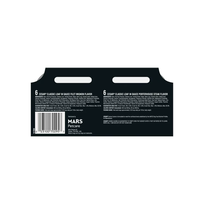 Dogs with sophisticated palates will enjoy a rich culinary experience with CESAR Canine Cuisine Gourmet Wet Dog Food. With US Beef as the #1 ingredient, these recipes will make your furry friend's mouth water and tail wag. CESAR Canine Cuisine Dog Food Variety Pack with Filet Mignon and Porterhouse Steak Flavors delight connoisseurs with a tantalizing classic loaf in sauce texture, and are enhanced with vitamins and minerals for complete and balanced nutrition. Served in convenient trays with no-fuss, peel-away freshness seals, CESAR Adult Dog Food makes mealtime easy. Our gourmet wet dog food also uses ingredients formulated to meet nutritional levels established by the AAFCO dog food nutrient profiles for maintenance.