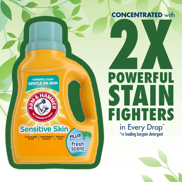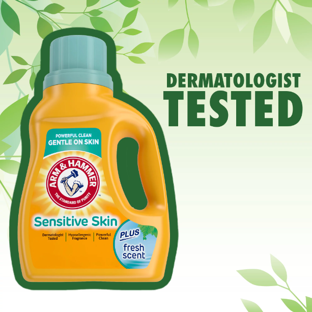 ARM & HAMMER Sensitive Skin Liquid Laundry Detergent is gentle on skin, but powerful on dirt. This HE laundry detergent liquid is concentrated with 2X powerful stain fighters in every load vs the leading value detergent, so it’s powerful enough to handle your toughest loads in all wash temperatures, even cold water. This laundry soap keeps laundry smelling fresh without irritating sensitive skin with a hypoallergenic, skin-friendly fresh scent that has been dermatologist-tested and passed four different clinical tests. This dye-free liquid laundry detergent is designed to work in standard and HE machines. For standard bottles, fill cap to Bar A for medium loads, or use half a capful for energy-saving cold water cycles compared to washing in warm water. Use a full cap of this dye-free detergent for large or heavily soiled loads. For larger dispenser sizes, fill to top of Line C for medium loads. For large or heavily soiled loads, use half a capful.