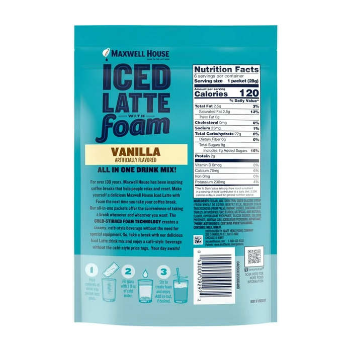 Indulge in the creamy, smooth taste of Maxwell House Iced Latte with Foam in Vanilla flavor. This convenient, easy-to-make coffee offers a delightful cold-stirred foam and rich vanilla notes for a perfect iced latte experience at home. Just add water, stir, and enjoy your refreshing latte in seconds. Each box contains 6 single-serve packets, making it simple to enjoy your favorite iced coffee anytime, anywhere. Experience the trusted quality and flavor of Maxwell House, crafted to be good to the last drop.