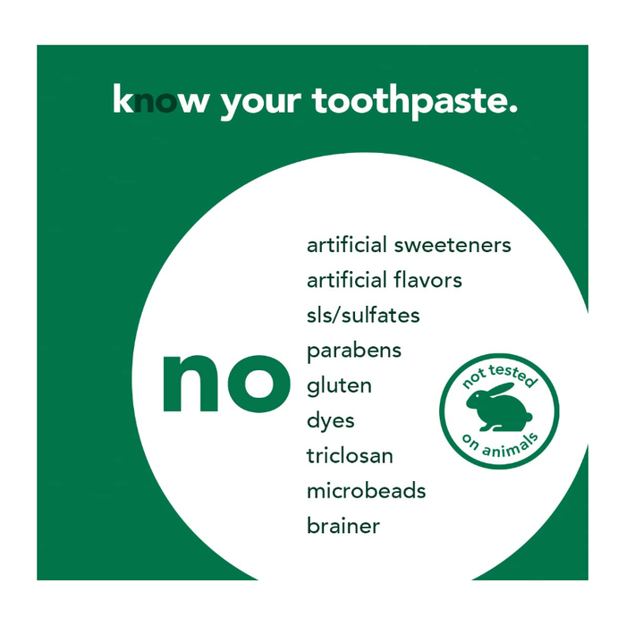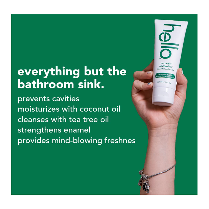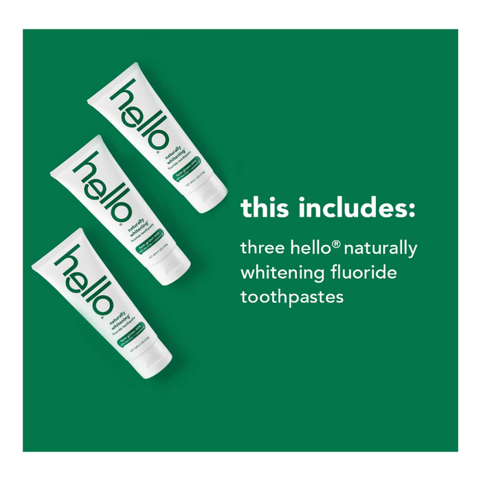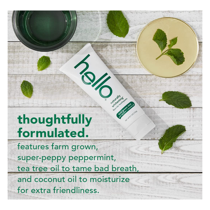 Say hello to naturally whitening fluoride toothpaste that tastes awesome and works brilliantly. This naturally friendly toothpaste is thoughtfully formulated with a calcium mineral blend that gently and naturally whitens teeth. But buckle-up, there's more goodness: this vegan toothpaste is peroxide free, dye free, SLS free, paraben free, triclosan free, preservative free and gluten free. hello toothpastes also contain no artificial sweeteners and no artificial flavors. As if that weren't enough magic for one tube, hello is vegan, cruelty free, never tested on animals (Leaping Bunny Certified and PETA recognized), and made in the USA. #choosefriendly