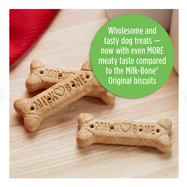 A classic crunch with a wag-worthy taste–now with even more meaty taste compared to the Milk-Bone Original biscuits you know and love. Better yet, the crunchy texture of Milk-Bone dog biscuits helps freshen dogs′ breath and reduces tartar build-up, so you can fully enjoy all those sloppy doggie kisses. These tasty dog treats even contain vitamins and minerals–12, to be exact. With included vitamins and minerals in every treat, the health of your pet is considered and cared for each time your pet wolfs down Milk-Bone Flavor Snacks.