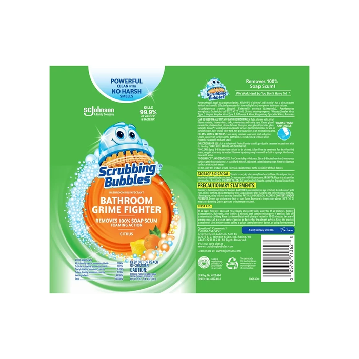 Scrubbing Bubbles Bathroom Grime Fighter Aerosol is a multisurface household disinfectant spray with a penetrating foam that takes on grime wherever it hides and kills 99.9% of viruses^ and bacteria*. With this all-purpose cleaner a clean bathroom is only a spray away. Bathroom Grime Fighter Aerosol is best for cleaning large bathroom spaces—like the bathtub or shower—and in hard-to-reach places like between tile and around fixtures. This 100% soap scum remover also delivers an amazing fragrance. Grime Fighter is an effective tile cleaner, sink cleaner, bathtub and shower cleaner, as well as an overall bathroom cleaner. This disinfectant cleaner is an easy way to get tough on bathroom surface messes. This disinfectant is also available in the following scents: Citrus, Floral Fusion and Rainshower, as well as an adjustable trigger spray. When used as directed, kills: ^Herpes Simplex Virus Type 1, Herpes Simplex Virus Type 2, Influenza A (H1N1) Virus, Respiratory Syncytial Virus, Rotavirus. *Staphylococcus aureus (Staph), Salmonella enterica (Salmonella), Pseudomonas aeruginosa, Escherichia coli 0157: H7 (E. coli), Listeria monocytogenes.