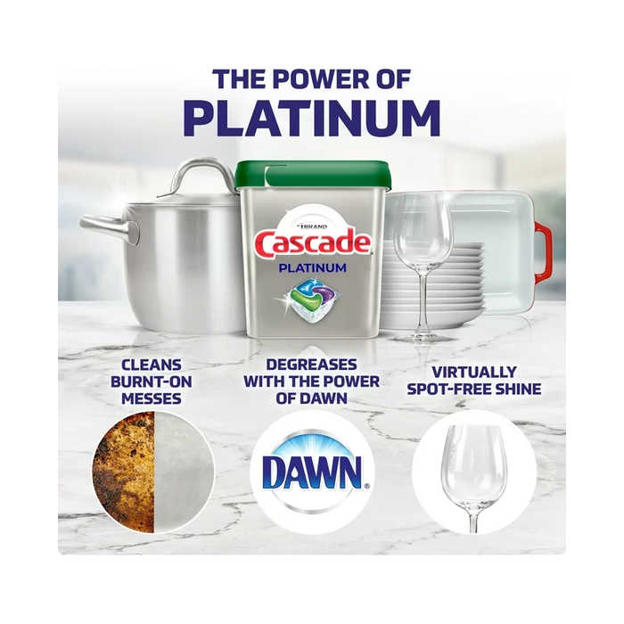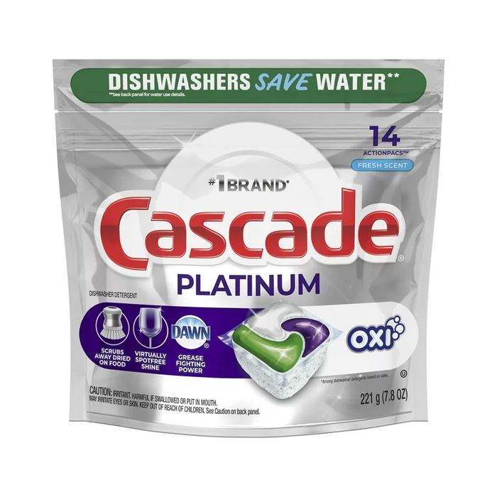 Cascade Platinum + Oxi Dishwashing Detergent is our best stain-fighting Action Pac, fighting tough food & beverage stains for virtually spotless dishes, every time. And it contains No Chlorine Bleach. Cascade Platinum +Oxi cleans burnt-on messes in just one wash, with no pre-wash needed. That's because Platinum has 50% More Cleaning Power* (*% cleaning ingredients vs. Cascade Complete Action Pacs) to tackle burnt-on foods. Fresh Scent, 14 Count