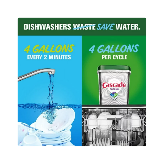 - Save up to 15 gallons of water per dishwasher load when you skip the pre-wash and run your dishwasher with Cascade Platinum