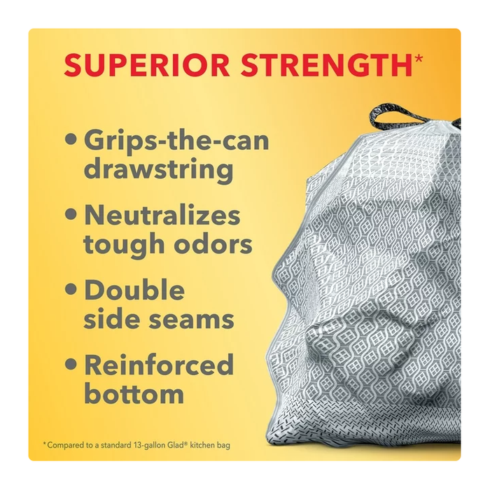 Handles Holiday Cleanups with ease. Glad ForceFlex MaxStrength Tall Kitchen Trash Bags provide strength and Gain Original scent with Febreze Freshness to keep your kitchen smelling fresh and clean. These 13 gallon bags are 25% more durable* with an outer leak protection layer and an inner layer that stretches to prevent rips and tears. 3 in 1 OdorShield technology and Gain with Febreze freshness provide odor control to help fight trash smells. The drawstring grips to the trash can, keeping the bag in place. With double side seams and a reinforced bottom, these bags are made with 100% renewable electricity. And heres something cool: if everyone in the U.S. chose Glad drawstring trash bags it would save 100 million pounds of plastic from going into landfills every year**. Certain trademarks used under license from The Procter & Gamble Company or its affiliates. *Vs. Glad 13 gallon ForceFlex bag. **Based on IRI sales data. Glad Kitchen drawstring bags are made with 7% to 22% less plastic vs top 10 competitors.