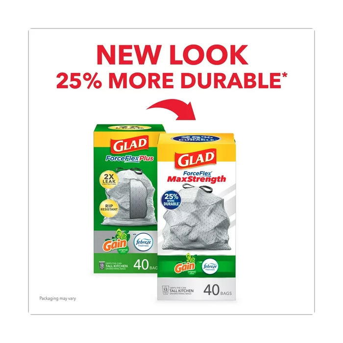 - 25% MORE DURABLE*: Glad ForceFlex MaxStrength Tall Kitchen Trash Bags are 25% more durable versus Glad 13 gallon ForceFlex tall kitchen bags; packaging may vary