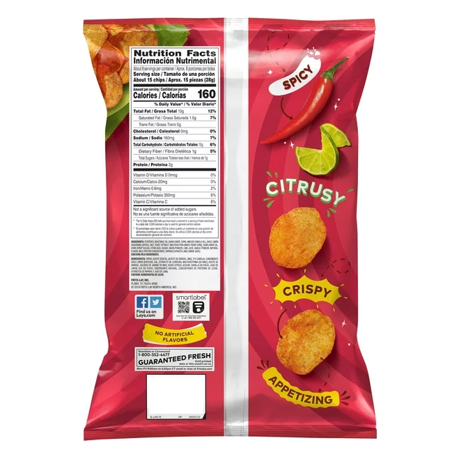 It all starts with farm-grown potatoes, cooked and seasoned to perfection. Then we add the spice of chilies and the zing of real lime. So every LAY'S potato chip is perfectly crispy and delicious. Happiness in Every Bite.