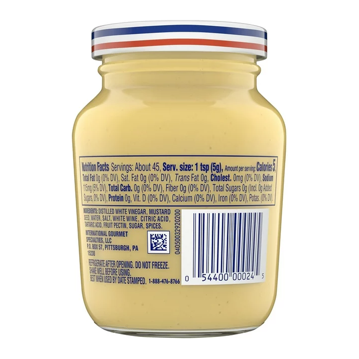 Unlock the potential of all your favorite foods with Grey Poupon Dijon Mustard. Since 1777, our dijon mustard has been prepared in accordance with the original recipe from Dijon, France. Made with #1 grade mustard seeds, our white wine infused mustard is blended with spices to offer the bold flavor you expect from Grey Poupon. Bring the refined taste of Grey Poupon Dijon Mustard to your favorite recipes and enjoy some of the finer flavors in life. Try using dijon mustard as a sandwich spread to add some boldness to lunchtime. Mix our tangy mustard sauce with balsamic vinegar and olive oil to create a flavorful salad dressing, or use it as an ingredient in a delicious dijon mustard marinade. Enhance any of your favorite chicken or pork entrees with Grey Poupon. Our dijon mustard comes in an 8-ounce resealable jar for easy use. Whether you’re making lunch or preparing for a dinner party, Grey Poupon Dijon Mustard will elevate your next meal or occasion.