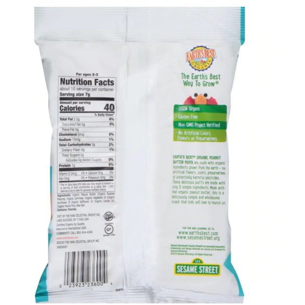 Earth's Best Organic Sesame Street Peanut Butter Baked Corn Puffs, 2.5 oz.