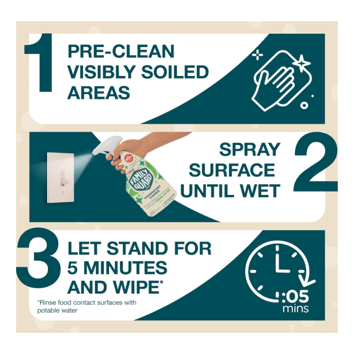 FamilyGuard Brand Disinfectant Cleaner is expertly formulated for use in homes with children and pets. on hard, non-porous surfaces*. FamilyGuard Brand Disinfectant Cleaner cleans and disinfects the high-traffic and hard, non-porous surfaces your family touches most, cutting through dirt, dust, grease and grime.Disinfects surfaces including kitchen tables, counter tops, stovetops, doorhandles, toilets, bathtubs, garbage cans, faucets and much more. FamilyGuard Brand Disinfectant cleaner is a fast and easy way to clean up everyday messes. To disinfect, pre-clean visibly soiled areas, spray hard, non-porous surfaces 6-8 inches from surface until visibly wet. Let surface stand for 5 minutes and wipe. Rinse with potable water before use.Look for FamilyGuard's full line of products including FamilyGuard Brand Disinfectant Spray.*Use as directed. See label for details.