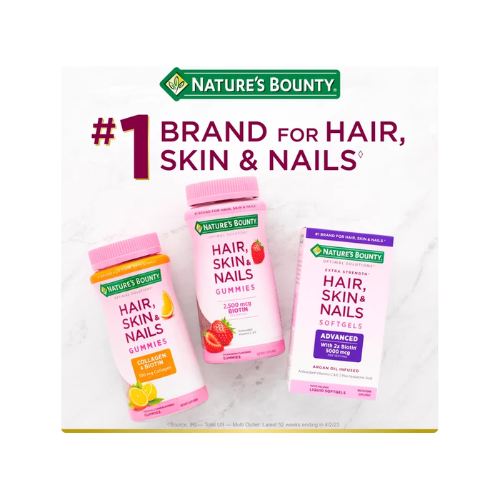 - BEAUTY-SUPPORTING BIOTIN.* Nature's Bounty Hair, Skin & Nails Gummies contain 2,500 mcg of biotin per serving, a vital nutrient that helps maintain healthy hair and support overall beauty*